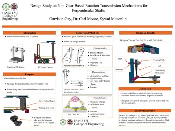 During my REU program at the FAMU-FSU College of Engineering, my project focused on the design and evaluation of non-gear-based rotational transmission mechanisms for perpendicular shafts, specifically to enhance the resolution and mechanical efficiency of 3D printers and robotic systems.
